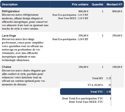 Cette présentation assure la transparence pour le client final et facilite le suivi comptable et administratif. Vous pouvez ainsi justifier clairement les montants collectés au titre de l’éco-participation, et les reverser ensuite à l’éco-organisme compétent.