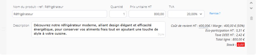 Lorsque vous ajoutez un produit concerné, le montant de l’éco participation et/ou le montant de la taxe DEEE s’affiche automatiquement en HT dans le détail du produit. Cela permet à vos clients de visualiser la part du prix correspondant à cette éco-contribution.