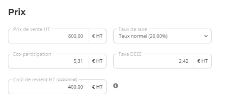 3. Indiquez le montant de la taxe DEEE : Dans la section Prix, un champ spécifique vous permet de renseigner le montant de la taxe DEEE (ou éco-participation). Ce montant sera ensuite automatiquement pris en compte lors de la création des devis ou des factures. L’avantage de cette méthode est de garantir une homogénéité et une conformité dans tous vos documents commerciaux, sans avoir à recalculer la taxe à chaque fois.